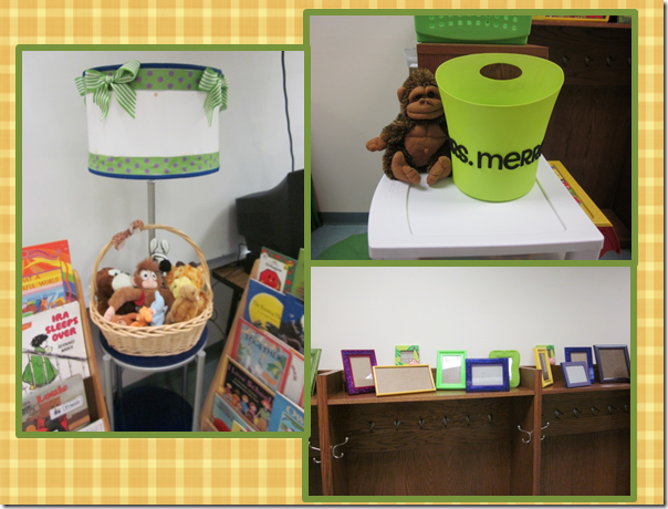 Wow! What a great start ladies! I can't wait to see how it looks after tomorrow! I am still waiting for my new principal to decide if I will have my own room this year or share with a new teacher. I want to start doing things, but really can't too much. I love all of the little cozt areas and littel touches in your room. The monkey shelf is adorable!