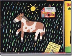 In “There was An Old Lady Who Swallowed a Fly” by Simms Taback you can see the use of artifacts in both the newspaper and in the ads on the barn.
