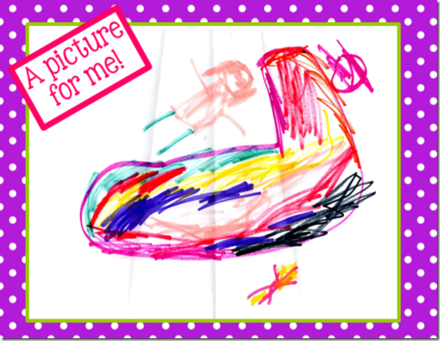 It was a rainy, cold day when I went to Karen’s school which meant no outside recess. So she opened up some of the center areas and let them play. One little girl, that I had earlier spent some time snuggled up with on a couch reading, brought me this picture. When I asked her to tell me her story, she said…no kidding this is what she really said…. “That is you and your shoe. You know the old lady who lived in a shoe! That’s you!” Oh my word! I almost died right there!